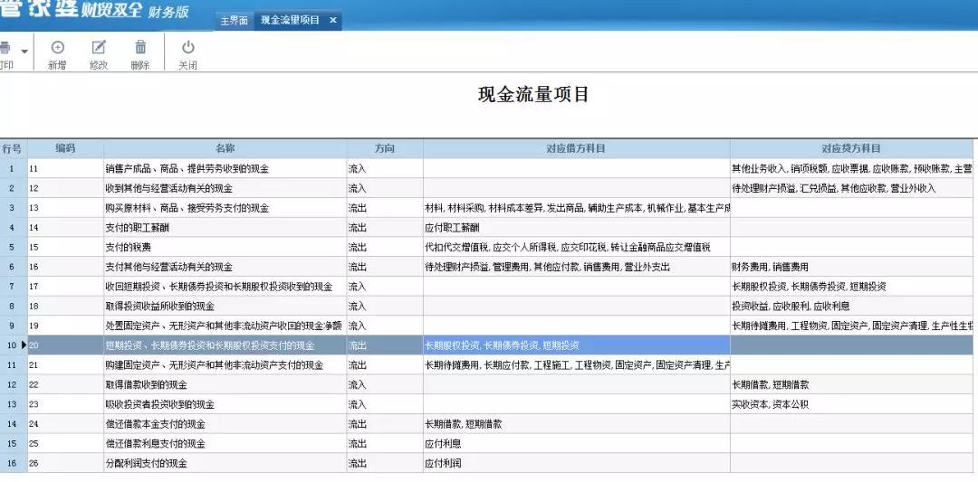 比如,可以在“销售产成品,商品,提供劳务收到的现金”这个是个流入科目,可以在对应贷方科目,设置现金或者银行的对方科目,双击后面对应的单元格就可以添加科目,如图;