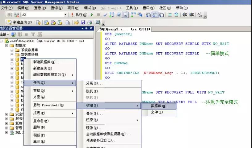 脚本执行完毕后,再点要处理的数据库,右键选择—‘任务’—收缩—数据库