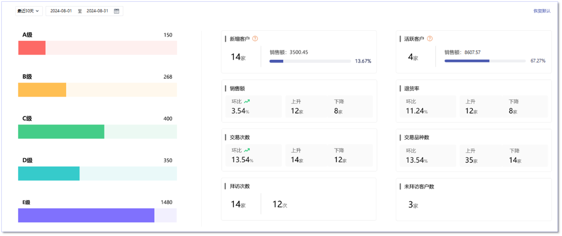 2)进入报表时,默认统计【所有已指定层级】的客户数据;用户点击左侧各级别,可分别查看不同层级内的指标值