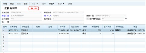 3、送修管理:若需要返厂或送到其他维修点进行维修的商品,可以送修管理。在发出维修品时需要填写送修发货单,在返回时填写送修返回单并确认与维修厂家之间的费用以及确认与顾客之间的维修费用。